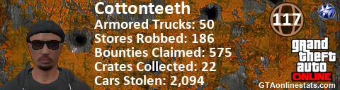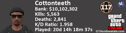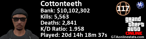 <a href="http://GTAonlinestats.com/showplayer/Cottonteeth"><img src="http://GTAonlinestats.com/signature/Cottonteeth/sig.png" alt="cottonteeth" border="0" /></a>