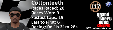 <a href="http://GTAonlinestats.com/showplayer/Cottonteeth"><img src="http://GTAonlinestats.com/racesignature/Cottonteeth/sig.png" alt="cottonteeth" border="0" /></a>