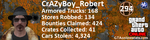[URL=http://GTAonlinestats.com/showplayer/CrAZyBoy_Robert][IMG]http://GTAonlinestats.com/crimesignature/CrAZyBoy_Robert/sig.png[/IMG][/URL]
