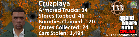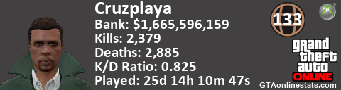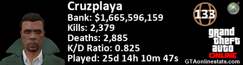 [URL=http://GTAonlinestats.com/showplayer/Cruzplaya][IMG]http://GTAonlinestats.com/signature/Cruzplaya/sig.png[/IMG][/URL]