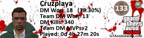 [URL=http://GTAonlinestats.com/showplayer/Cruzplaya][IMG]http://GTAonlinestats.com/dmsignature/Cruzplaya/sig.png[/IMG][/URL]