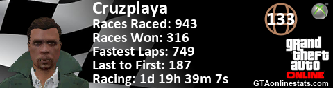 [URL=http://GTAonlinestats.com/showplayer/Cruzplaya][IMG]http://GTAonlinestats.com/racesignature/Cruzplaya/sig.png[/IMG][/URL]