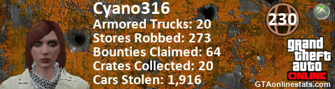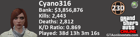 <a href="http://GTAonlinestats.com/showplayer/Cyano316"><img src="http://GTAonlinestats.com/randomsignature/Cyano316/sig.png" alt="Cyano316" border="0" /></a>