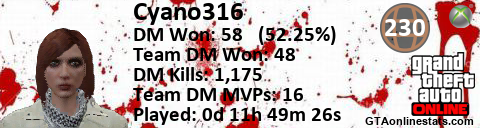 [URL=http://GTAonlinestats.com/showplayer/Cyano316][IMG]http://GTAonlinestats.com/dmsignature/Cyano316/sig.png[/IMG][/URL]