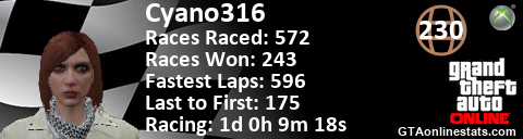 <a href="http://GTAonlinestats.com/showplayer/Cyano316"><img src="http://GTAonlinestats.com/racesignature/Cyano316/sig.png" alt="Cyano316" border="0" /></a>