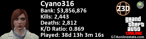 [URL=http://GTAonlinestats.com/showplayer/Cyano316][IMG]http://GTAonlinestats.com/signature/Cyano316/sig.png[/IMG][/URL]