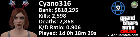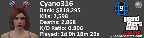 [URL=http://GTAonlinestats.com/showplayer/Cyano316/3][IMG]http://GTAonlinestats.com/signature/Cyano316/3/sig.png[/IMG][/URL]