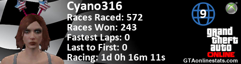 [URL=http://GTAonlinestats.com/showplayer/Cyano316/3][IMG]http://GTAonlinestats.com/racesignature/Cyano316/3/sig.png[/IMG][/URL]