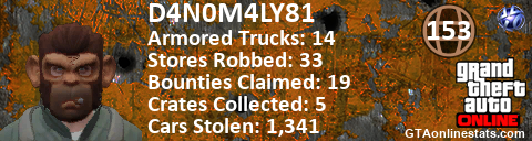 [URL=http://GTAonlinestats.com/showplayer/D4N0M4LY81][IMG]http://GTAonlinestats.com/crimesignature/D4N0M4LY81/sig.png[/IMG][/URL]