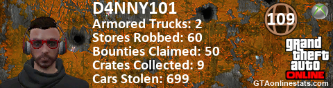 [URL=http://GTAonlinestats.com/showplayer/D4NNY101][IMG]http://GTAonlinestats.com/crimesignature/D4NNY101/sig.png[/IMG][/URL]