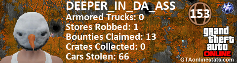 [URL=http://GTAonlinestats.com/showplayer/DEEPER_IN_DA_ASS][IMG]http://GTAonlinestats.com/crimesignature/DEEPER_IN_DA_ASS/sig.png[/IMG][/URL]