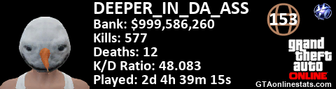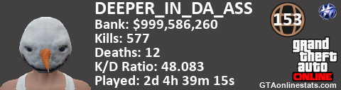 [URL=http://GTAonlinestats.com/showplayer/DEEPER_IN_DA_ASS][IMG]http://GTAonlinestats.com/signature/DEEPER_IN_DA_ASS/sig.png[/IMG][/URL]