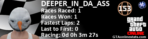 <a href="http://GTAonlinestats.com/showplayer/DEEPER_IN_DA_ASS"><img src="http://GTAonlinestats.com/racesignature/DEEPER_IN_DA_ASS/sig.png" alt="DEEPER_IN_DA_ASS" border="0" /></a>
