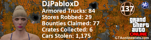 [URL=http://GTAonlinestats.com/showplayer/DJPabloxD][IMG]http://GTAonlinestats.com/crimesignature/DJPabloxD/sig.png[/IMG][/URL]