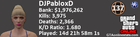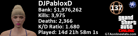 <a href="http://GTAonlinestats.com/showplayer/DJPabloxD"><img src="http://GTAonlinestats.com/dmsignature/DJPabloxD/sig.png" alt="DJPabloxD" border="0" /></a>