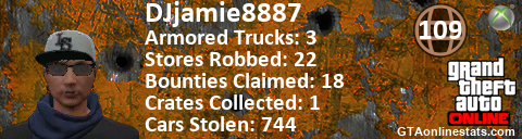 [URL=http://GTAonlinestats.com/showplayer/DJjamie8887][IMG]http://GTAonlinestats.com/crimesignature/DJjamie8887/sig.png[/IMG][/URL]