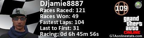 [URL=http://GTAonlinestats.com/showplayer/DJjamie8887][IMG]http://GTAonlinestats.com/racesignature/DJjamie8887/sig.png[/IMG][/URL]