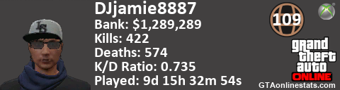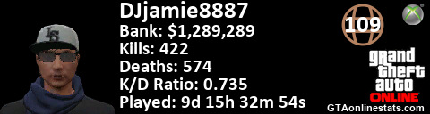<a href="http://GTAonlinestats.com/showplayer/DJjamie8887"><img src="http://GTAonlinestats.com/signature/DJjamie8887/sig.png" alt="DJjamie8887" border="0" /></a>