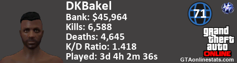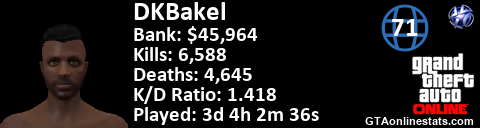 <a href="http://GTAonlinestats.com/showplayer/DKBakel"><img src="http://GTAonlinestats.com/dmsignature/DKBakel/sig.png" alt="DKBakel" border="0" /></a>
