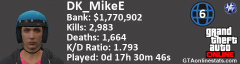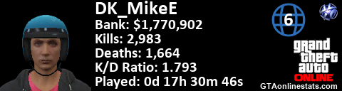 <a href="http://GTAonlinestats.com/showplayer/DK_MikeE/2"><img src="http://GTAonlinestats.com/dmsignature/DK_MikeE/2/sig.png" alt="DK_MikeE" border="0" /></a>