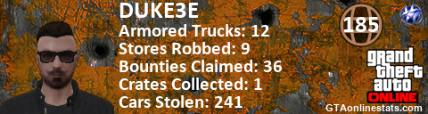 [URL=http://GTAonlinestats.com/showplayer/DUKE3E][IMG]http://GTAonlinestats.com/crimesignature/DUKE3E/sig.png[/IMG][/URL]