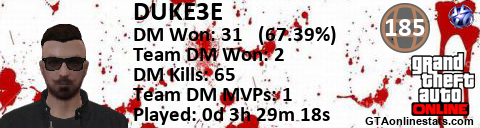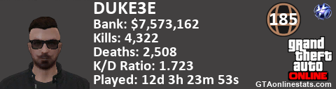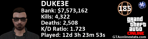 [URL=http://GTAonlinestats.com/showplayer/DUKE3E][IMG]http://GTAonlinestats.com/signature/DUKE3E/sig.png[/IMG][/URL]