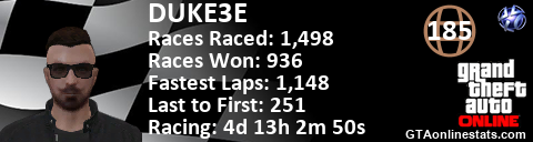 [URL=http://GTAonlinestats.com/showplayer/DUKE3E][IMG]http://GTAonlinestats.com/racesignature/DUKE3E/sig.png[/IMG][/URL]