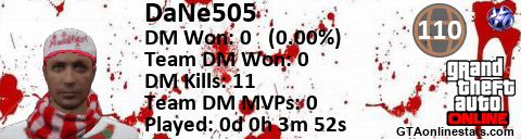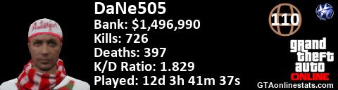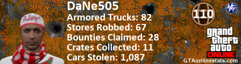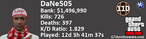 [URL=http://GTAonlinestats.com/showplayer/DaNe505/2][IMG]http://GTAonlinestats.com/signature/DaNe505/2/sig.png[/IMG][/URL]