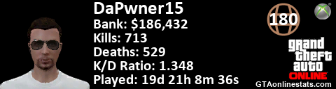 [URL=http://GTAonlinestats.com/showplayer/DaPwner15][IMG]http://GTAonlinestats.com/signature/DaPwner15/sig.png[/IMG][/URL]