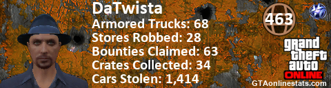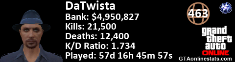[URL=http://GTAonlinestats.com/showplayer/DaTwista][IMG]http://GTAonlinestats.com/randomsignature/DaTwista/sig.png[/IMG][/URL]