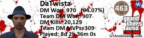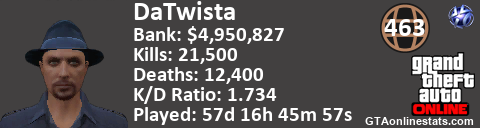 [URL=http://GTAonlinestats.com/showplayer/DaTwista][IMG]http://GTAonlinestats.com/dmsignature/DaTwista/sig.png[/IMG][/URL]