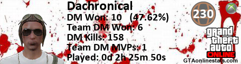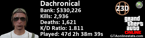 [URL=http://GTAonlinestats.com/showplayer/Dachronical][IMG]http://GTAonlinestats.com/signature/Dachronical/sig.png[/IMG][/URL]
