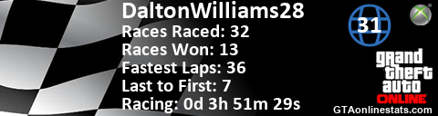 [URL=http://GTAonlinestats.com/showplayer/DaltonWilliams28][IMG]http://GTAonlinestats.com/racesignature/DaltonWilliams28/sig.png[/IMG][/URL]