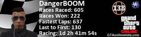 [URL=http://GTAonlinestats.com/showplayer/DangerBOOM][IMG]http://GTAonlinestats.com/racesignature/DangerBOOM/sig.png[/IMG][/URL]