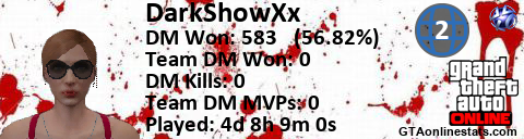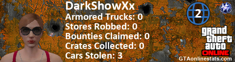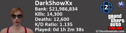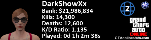 [URL=http://GTAonlinestats.com/showplayer/DarkShowXx/2][IMG]http://GTAonlinestats.com/dmsignature/DarkShowXx/2/sig.png[/IMG][/URL]