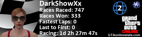 [URL=http://GTAonlinestats.com/showplayer/DarkShowXx/2][IMG]http://GTAonlinestats.com/racesignature/DarkShowXx/2/sig.png[/IMG][/URL]