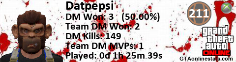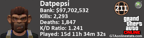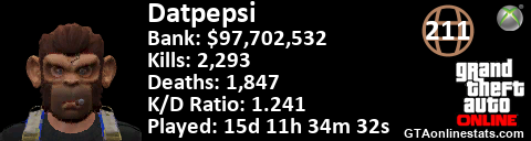 [URL=http://GTAonlinestats.com/showplayer/Datpepsi][IMG]http://GTAonlinestats.com/dmsignature/Datpepsi/sig.png[/IMG][/URL]