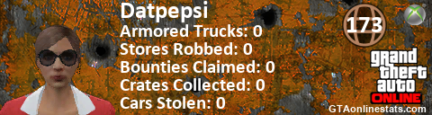 [URL=http://GTAonlinestats.com/showplayer/Datpepsi/2][IMG]http://GTAonlinestats.com/crimesignature/Datpepsi/2/sig.png[/IMG][/URL]