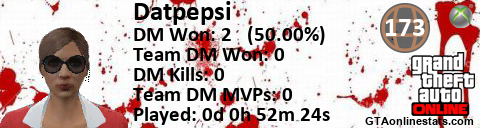 [URL=http://GTAonlinestats.com/showplayer/Datpepsi/2][IMG]http://GTAonlinestats.com/dmsignature/Datpepsi/2/sig.png[/IMG][/URL]