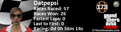 [URL=http://GTAonlinestats.com/showplayer/Datpepsi/2][IMG]http://GTAonlinestats.com/racesignature/Datpepsi/2/sig.png[/IMG][/URL]