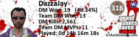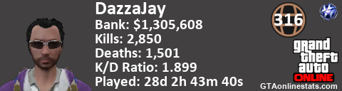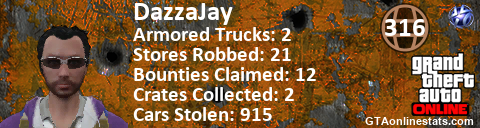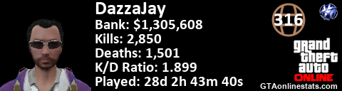[URL=http://GTAonlinestats.com/showplayer/DazzaJay][IMG]http://GTAonlinestats.com/randomsignature/DazzaJay/sig.png[/IMG][/URL]