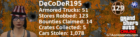 [URL=http://GTAonlinestats.com/showplayer/DeCoDeR195/2][IMG]http://GTAonlinestats.com/crimesignature/DeCoDeR195/2/sig.png[/IMG][/URL]