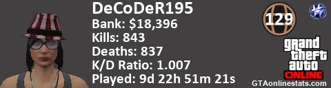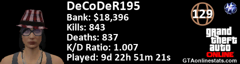 <a href="http://GTAonlinestats.com/showplayer/DeCoDeR195/2"><img src="http://GTAonlinestats.com/signature/DeCoDeR195/2/sig.png" alt="DeCoDeR195" border="0" /></a>