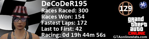 [URL=http://GTAonlinestats.com/showplayer/DeCoDeR195/2][IMG]http://GTAonlinestats.com/racesignature/DeCoDeR195/2/sig.png[/IMG][/URL]
