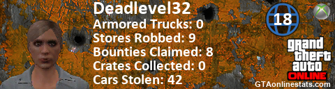 [URL=http://GTAonlinestats.com/showplayer/Deadlevel32/2][IMG]http://GTAonlinestats.com/crimesignature/Deadlevel32/2/sig.png[/IMG][/URL]