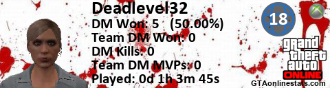 [URL=http://GTAonlinestats.com/showplayer/Deadlevel32/2][IMG]http://GTAonlinestats.com/dmsignature/Deadlevel32/2/sig.png[/IMG][/URL]