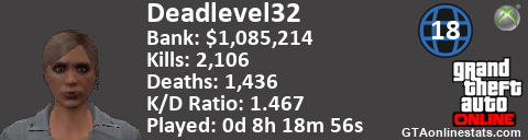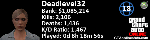 [URL=http://GTAonlinestats.com/showplayer/Deadlevel32/2][IMG]http://GTAonlinestats.com/signature/Deadlevel32/2/sig.png[/IMG][/URL]
