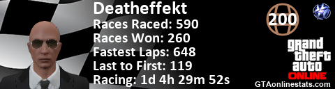 [URL=http://GTAonlinestats.com/showplayer/Deatheffekt][IMG]http://GTAonlinestats.com/racesignature/Deatheffekt/sig.png[/IMG][/URL]