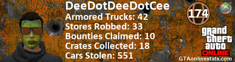 [URL=http://GTAonlinestats.com/showplayer/DeeDotDeeDotCee][IMG]http://GTAonlinestats.com/crimesignature/DeeDotDeeDotCee/sig.png[/IMG][/URL]