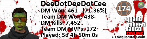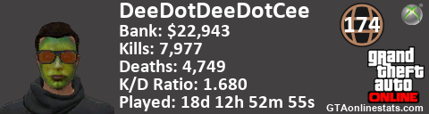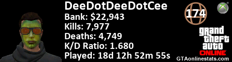 <a href="http://GTAonlinestats.com/showplayer/DeeDotDeeDotCee"><img src="http://GTAonlinestats.com/dmsignature/DeeDotDeeDotCee/sig.png" alt="DeeDotDeeDotCee" border="0" /></a>